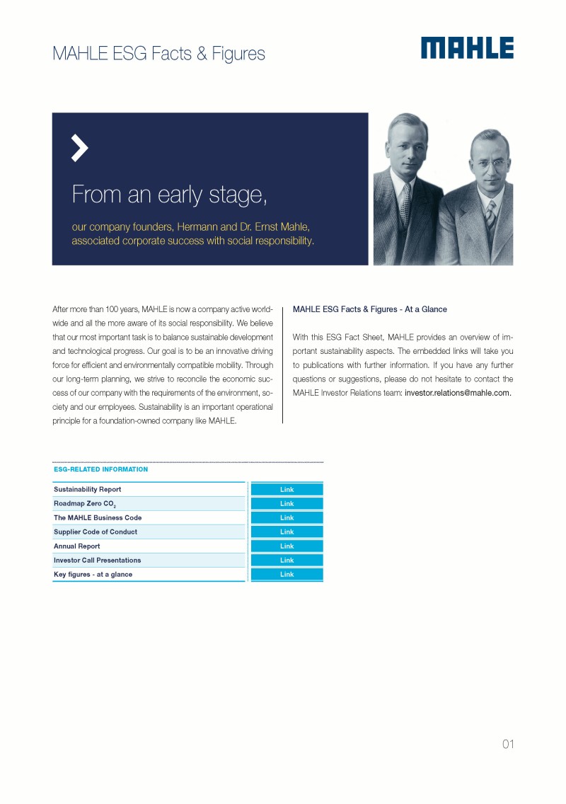MAHLE publishes annual Sustainability Reports, which explore in detail the topic of sustainability in all business areas. All reports published since 2018/2019 are available online.